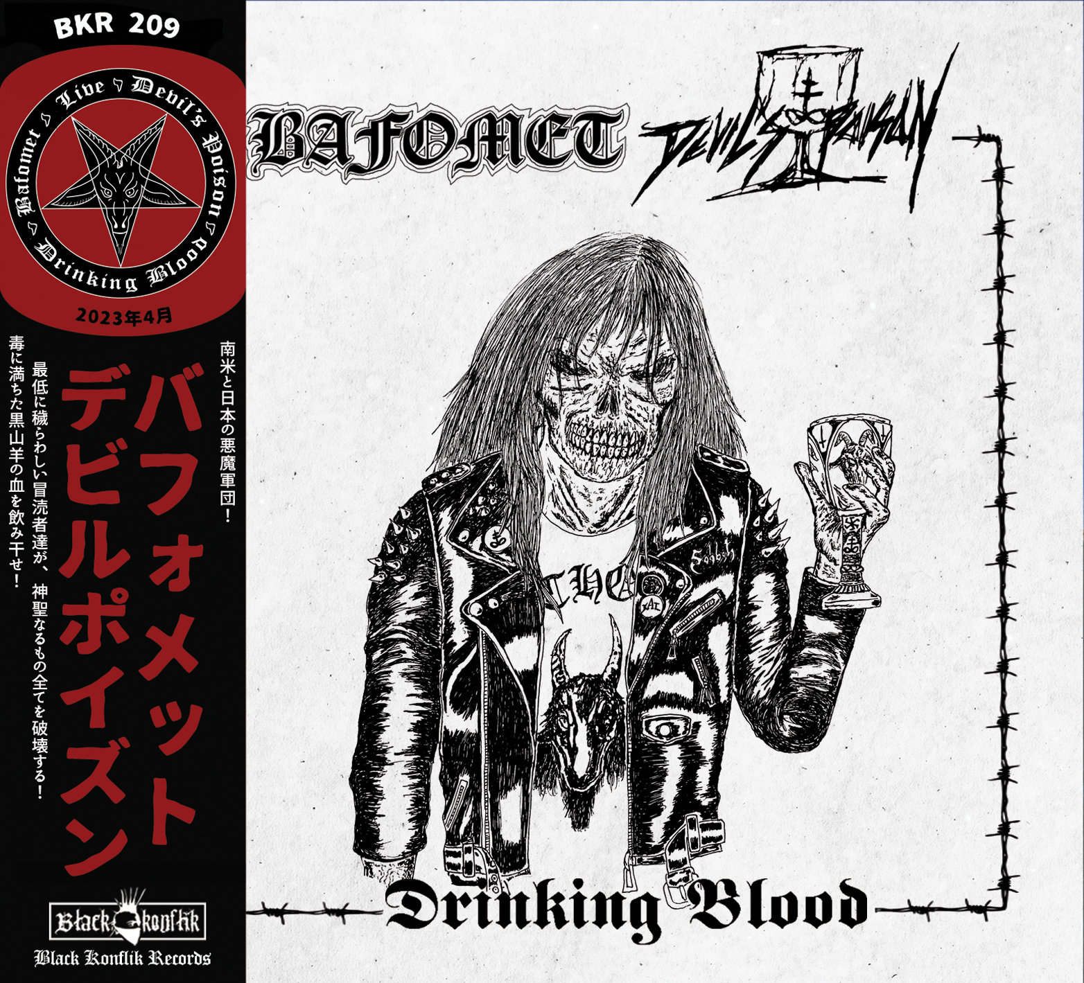 A split live recording between Tokyo and Chile Blacked /Thrash Metal punk. This CD contains 10 tracks that are recorded from each band's live show, which BAFOMET recorded at 'Gate and Barricade Ver. 2.1" show along with BLAZE and TECHNOCRACY as headliners, and DEVIL'S POISON recorded at Suicide Records fest 1 in April 31th 2022. As the band mentioned HAIL LEGION EJECUTOR! METAL VENENOSO and PRAISE THE GOAT, here the drinking blood live raw split CD.