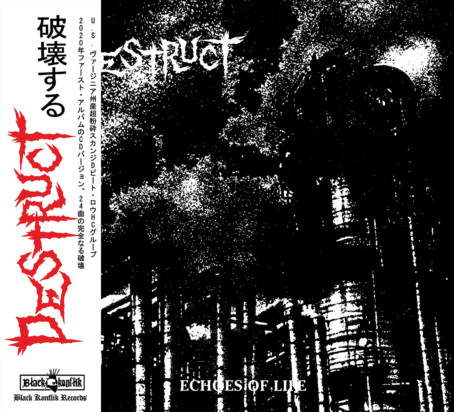 Hailing from Richmond, VA, DESTRUCT sounds like an unfuckable great mix of BAST*RD, DEATH SIDE, JUDGEMENT, and FRAMTID. Imagine the aforementioned bands, blend and mold it back together, trim all the fat, and that’s Echoes of Life. DESTRUCT makes the international hardcore enthusiast dream a reality: if BAST*RD was a currently active band, still in their prime and releasing another great record in 2020. DESTRUCT accompolishes something DEATHREAT tried to accomplish 20 years ago with Consider It War, but perhaps an even better articulated version of the ’90s Japanese hardcore approach. Sounds like something that was recorded at Our House in Tokyo in the mid-’90s but was actually mastered at Enormous Door by Jack Control of WORLD BURNS TO DEATH, who is way too familiar with that type of production and nails it beyond perfection. This is no-frills, straight up devestating dark hardcore punk without having any gimmicks, macho-ness, or cosplay-ness, which is something many of us are looking for in the current punk scene that seems to have its head stuck up its ass or is way too concerned about what the next leading hip trend will be. One might criticize how much they can just listen to BAST*RD instead, but this perhaps is a great example of learning something from the past and creating something even better with it. Highly recommended. ( MAXIMUM ROCKNROLL #447 AUGUST 2020 ).